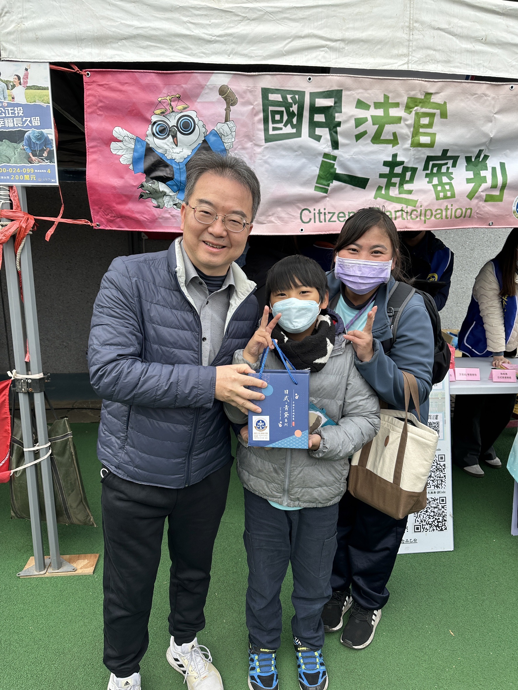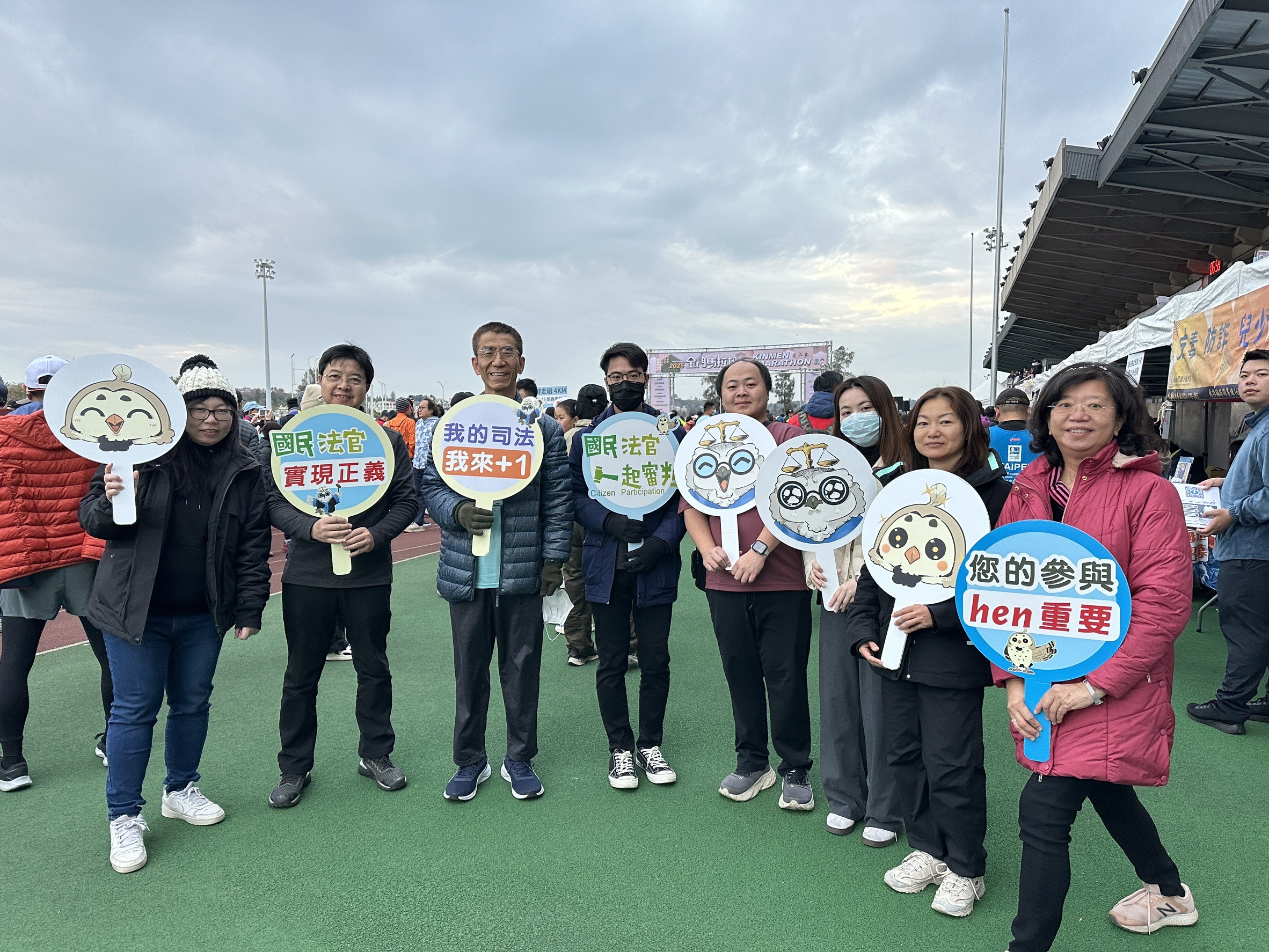 福建金門地方法院於114年1月18日清晨參與「金門馬拉松健康休閒組」設攤宣導國民法官制度,由陳院長連發、黃庭長建都率領本院行政團隊,在馬拉松大會會場進行宣導,以玩平板小遊戲及有獎徵答發放小禮物方式與選手互動,幫選手們加油打氣,拉近司法與人民的距離。